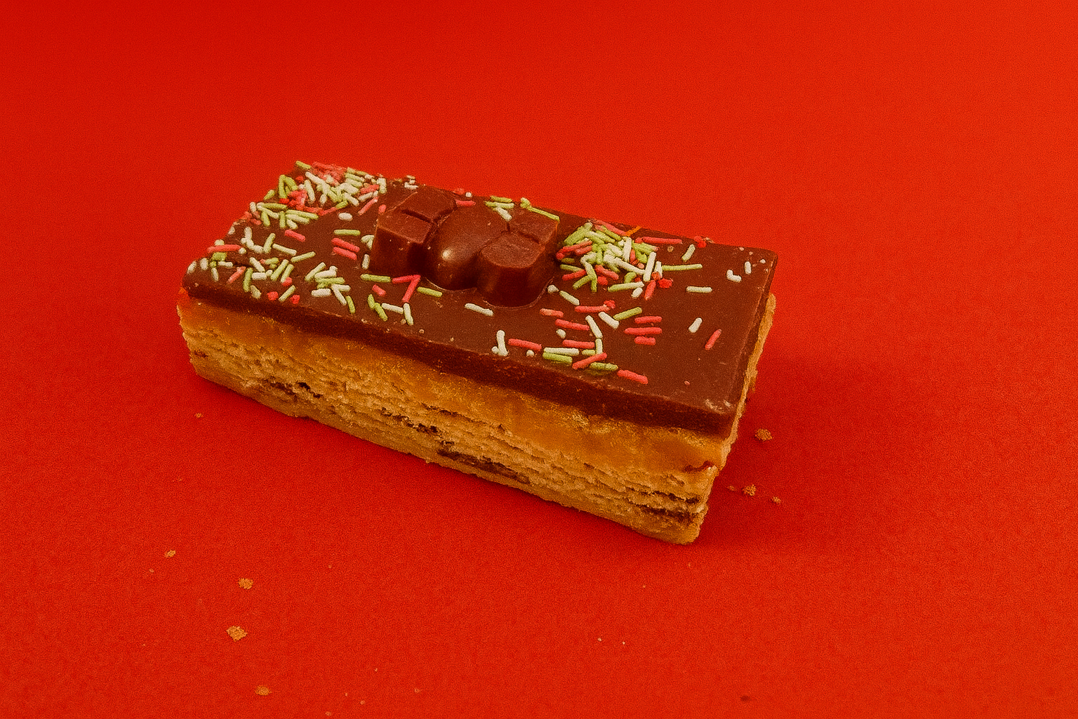 A milk chocolate chip cookie base layered with smooth caramel, then topped with a set chocolate layer, Christmas sprinkles, and a gluten-free Christmas KitKat character.