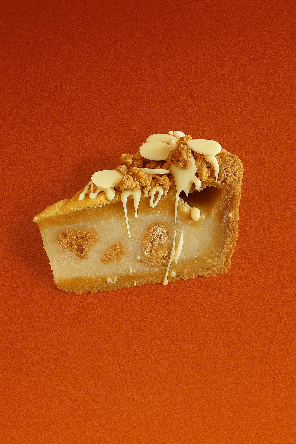 This cookie pie starts with our soft white chocolate chip dough, filled with a thick layer of creamy white chocolate ganache, chunks of white chocolate gingerbread blondie, and crunchy ginger snap biscuits.