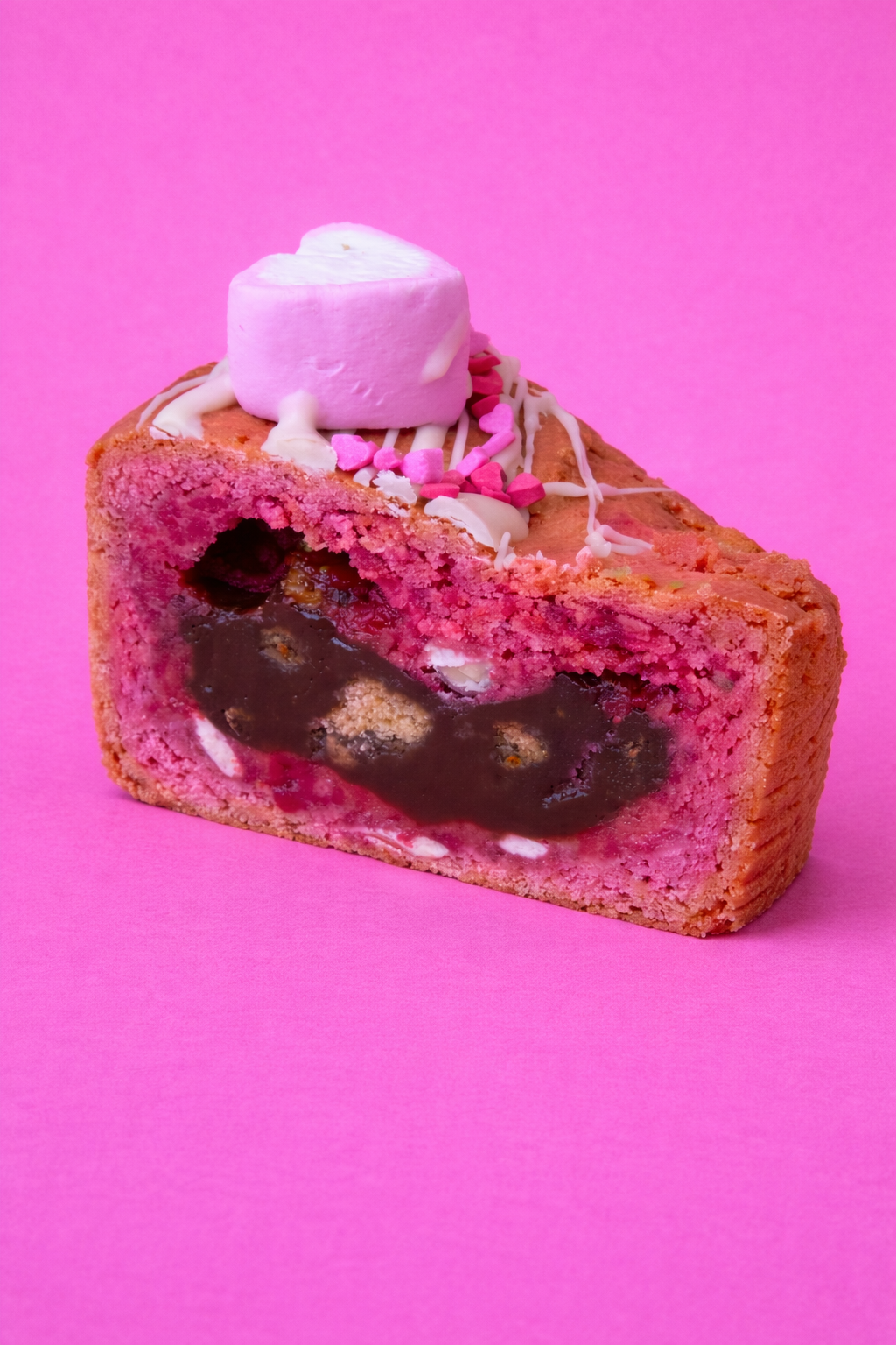 Our Valentine’s S’mores Cookie Pie is the ultimate comfort dessert with a romantic twist. Made with soft pink cookie dough and white chocolate chips, it’s filled with a dreamy combination of milk chocolate ganache, crunchy digestive biscuit pieces, gooey heart-shaped marshmallows and melty pink chocolate running through the middle.